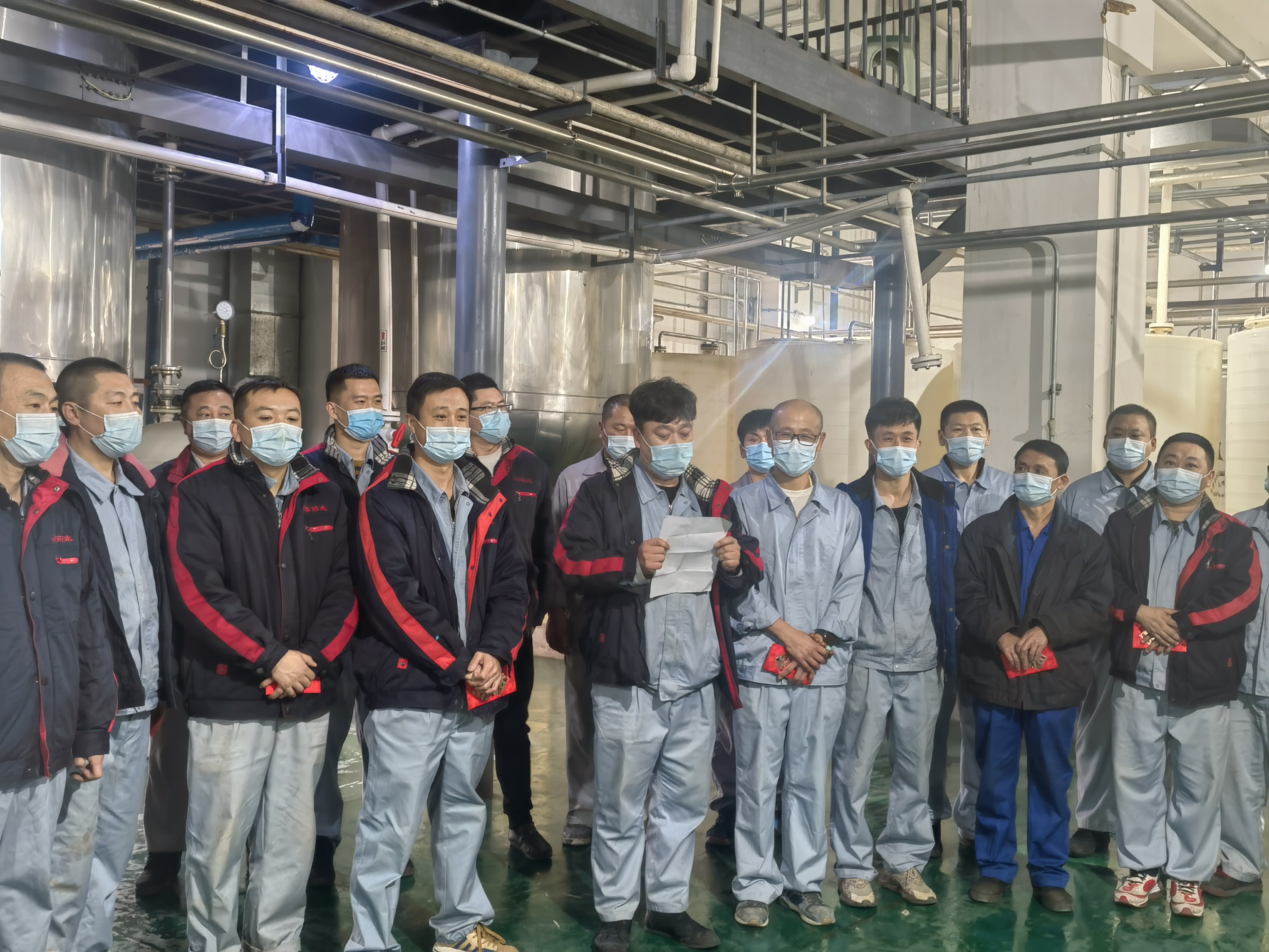 作為保供企業(yè),為了滿足市場(chǎng)藥品需要,公司重點(diǎn)供應(yīng)藥品的生產(chǎn)不能停。經(jīng)過(guò)向上級(jí)疫情防控指揮中心申請(qǐng)獲批準(zhǔn)后,公司研究決定,原料生產(chǎn)總監(jiān)劉剛組織下,在鑫泰基副總經(jīng)理劉新華、原料車間副主任馬尚于洋帶領(lǐng)下,原料車間的32名一線員工他們甚至都沒(méi)有時(shí)間來(lái)得及安頓好家人,毫不猶豫的從29日起,就開(kāi)始日夜堅(jiān)守在工作崗位上。由于人員有限,生產(chǎn)任務(wù)艱巨,他們每個(gè)人的工作量超出平常工作強(qiáng)度,有些員工常常深夜還忙碌在生產(chǎn)崗位上,有時(shí)天還沒(méi)亮,就又開(kāi)始了新一天的工作。白天他們加緊生產(chǎn),晚上睡在潔凈區(qū)、操作間、休息室、辦公室臨時(shí)準(zhǔn)備鋪蓋上窄小的折疊床上。由于緊張的工作頻率,又不能夠很好的休息很多員工感冒了,但他們沒(méi)有一個(gè)人退縮,沒(méi)有一句怨言,吃著感冒藥、消炎藥崗位上堅(jiān)守了余天,保質(zhì)保量完成了生產(chǎn)任務(wù)。